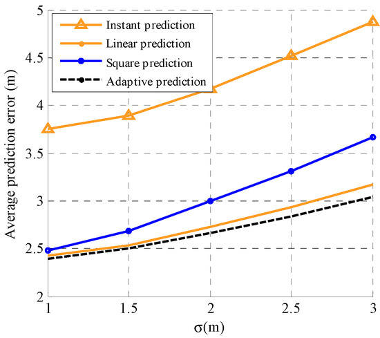 In order to assess the performance of the proposed adaptive prediction model, we compare it with linear prediction and square prediction. We consider a 50 m × 50 m plane with 10 moving nodes. The prediction error is defined as the distance between the true position and the prediction position. The average prediction errors in Figure 2, Figure 3 and Figure 4 are obtained by averaging over 10,000 realizations, with each realization continuing 20 time slots.