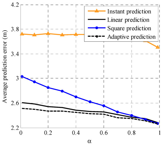 To further evaluate the performance of the proposed adaptive prediction model, we compare the proposed model with linear prediction, square prediction, and instant prediction, which use the movements in x axis and y axis at the (k−1)th time slot to predict the position at the kth time slot. Simulation configurations are , , , , and . The performance comparison of the four prediction models with different standard deviations of the random variables and is shown in Figure 3. It is observed that the average prediction error of the four prediction models increases with an increase in . Specifically, the performance of instant prediction is the worst and the performance of the proposed adaptive prediction is the best. Moreover, the advantage of the proposed adaptive prediction model is more obvious when is bigger. Figure 4 illustrates the performance of the four prediction models with different adjustment parameter values. Simulation configurations are , , , and . It can be observed that the average prediction error of the proposed adaptive prediction model is smaller than the other three prediction models and the difference is bigger with increasing . In fact, from the Gauss–Markov mobility model in Equation (31), we see that the randomness of motion rises with the decline of and the increase in . Therefore, the proposed adaptive prediction model better adapts to different motion patterns than the other three prediction models.