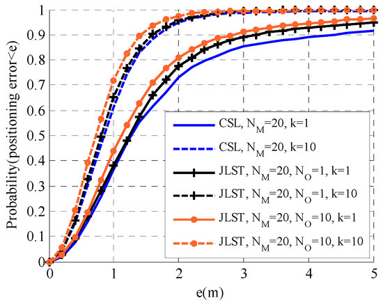 Self-localization performance of the proposed JSLT algorithm and the cooperative self-localization (CSL) algorithm in [23] with different numbers of agents and targets are shown in Figure 5 and Figure 6. In Figure 5, , or 10; in Figure 6, , or 5. It can be seen that the localization performance of both algorithms improves as time increases. This is because the agents’ and their neighbors’ positions become more accurate with the increase in time. However, a higher k value does not always correspond to improved positioning accuracy. The estimated accuracy becomes stable as time goes on. Furthermore, in the two scenarios, the proposed JSLT algorithm has a higher positioning accuracy than the CSL algorithm. This is because, in the JSLT algorithm, agents not only use the distance observation from the neighboring anchors and agents as in the CSL algorithm, but they also make use of the ranging measurements from the targets that they can detect, which improves the self-localization accuracy. Moreover, the performance of the two algorithms is quite different with fewer agents and more targets. When the density of agents is high, agents have enough neighbors. Therefore, they can localize themselves well by cooperating with neighboring anchors and agents. However, when the density of agents is low, many agents have few neighboring anchors and agents to localize themselves. In this case, the ranging measurements from targets play an important role in the self-localization of agents. The computational complexity of both algorithms depends on the number of neighbors. For agent , we define , , and to denote the number of neighboring agents, anchors, and targets that can detected at a certain time. The computational complexity of the CSL algorithm and the proposed JSLT algorithm are and , respectively. With regard to communication overhead, as all messages are approximated to Gaussian function, each agent broadcasts the mean and the covariance to its neighbors and collects the information broadcasted by its neighbors. The information collected by each agent is and for the CSL algorithm and the proposed JSLT algorithm, respectively. Since , the complexity and the communication overhead of the two algorithms are similar.