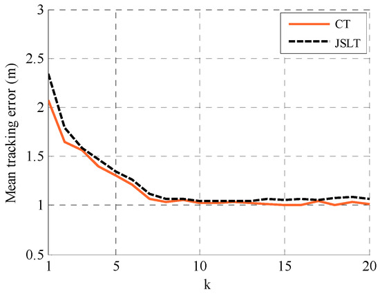 Figure 7 shows the tracking performance of the proposed JSLT algorithm and the centralized tracking (CT) algorithm is illustrated with and . In the CT algorithm, agents first localize themselves using the CSL algorithm in [23], then anchors and agents track the targets by sending information to a control center. As shown in Figure 7, the tracking performance of the proposed distributed JSLT algorithm is very close to that of CT algorithm, but the communication overhead of JSLT algorithm is much less than that of CT algorithm. In the CT algorithm, the information collected and broadcasted by each node (anchor or agent) are both proportional to the number of neighbors. In the proposed JLST algorithm, each node broadcasts its global average to its neighbors and collects global averages broadcasted by its neighbors, which is proportional to the number of neighbors. Therefore, the communication overhead sharply reduces by half. Moreover, in the CT algorithm, anchors and agents transmit information to the control center in a multi-hop manner, which leads to a fair amount of redundant information in the networks and information delay.