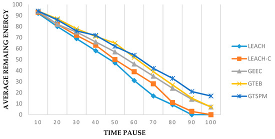 Another energy consumption analysis against the varying number of nodes is given in Figure 6. The values were recorded at time pause 50 for each set of nodes. GTSPM gave similar results as those of GTEB. However, it is notable that the performance of GTSPM is associated with the network size. Other protocols did not respond well to the increased number of nodes, as compared to GTSPM. It can be noted that at the beginning, with fewer nodes, the performance of GTSPM was lower than GTEB. As the number of nodes increased, the average remaining energy of all the nodes in GTSPM protocols rose higher than GTEB. This was because of additional mechanisms introduced by GTSPM.