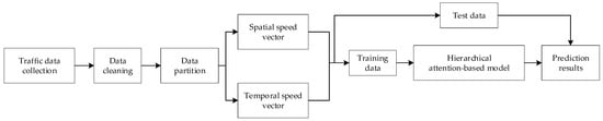 With the overview of recent studies on short-term traffic speed prediction, a traffic speed prediction approach based on temporal clustering and hierarchical attention (TCHA) is proposed. Figure 1 shows the framework of this paper. We collected raw traffic speed data from cameras equipped on roads, capturing the passing vehicles and saving information into databases. Certain data cleaning methods were then employed to remove anomaly elements. The third step was to partition the pre-processed data into several clusters using a hierarchical temporal clustering algorithm. Traffic data in each cluster has a similar distribution, which can help improve the prediction accuracy. Following the above steps, two traffic speed vectors, which contain temporal speeds and spatial speeds respectively, were generated, and a hierarchical attention-based method was then applied to these two vectors to capture spatial and temporal features. In the encoder, spatial vectors were taken as inputs, and the relevance of each selected road was determined with the spatial attention. The hidden states computed from the encoder together with the temporal vectors were concatenated as inputs for the decoder. In the decoder, the importance of each time step was calculated with the temporal attention. Finally, a fully connected layer was used for prediction. Each part is detailed in the following subsections.