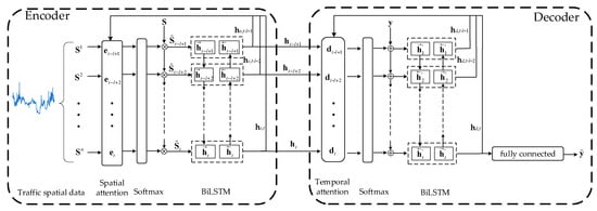 The encoder is essentially a BiLSTM network [41], aiming to determine the importance of each space point. Given the input spatial sequences at time step t, , where n is the number of selected surrounding roads, and l is the time lags. The spatial matrix can also be written as , where represents the speed matrix of road i at all time steps.