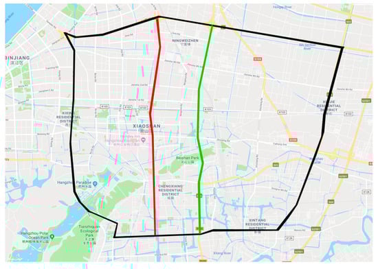 As is shown in Figure 3, to evaluate the performance of the proposed TCHA method, part of the Xiaoshan District was chosen to performance experiments (in black), Shixin Road (in red) and Tonghui Road (in green) were selected as target roads, and the remaining segments were used to determine the spatial features. There were 38 detectors along the whole roads, and the traffic speed data were collected and calculated every 5 min. Consequently, one detector preserved 288 data per day. As mentioned before, we partitioned the raw traffic speed data into two vectors; however, due to the malfunction of detectors and the failure of data transmission, there were some incorrect data, which includes the following: