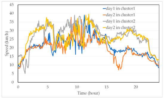 Figure 4 is a plot of several typical traffic speeds over time, which demonstrates obvious period patterns. Different distributions of traffic speed data in different clusters after employing TC can be seen in Figure 5. It is clear that the traffic speed data in the same cluster have similar distributions, while the distribution may differ more when the data come from two clusters.