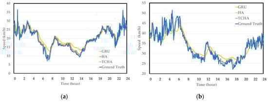 Figure 6 shows the curves of the predicted results corresponding to the ground truth on both roads. Different colors represent different algorithms, during the entire day. The proposed TCHA algorithm fits the true speed data whether it is peak hour or not. In Figure 6b, the difference between the ground truth and the results of the proposed method is relatively large around 15 h, which may be due to the large variation when traffic speed meets peak hour. Peak hour and emergencies are challenges when making short-term predictions. The large influence can be seen more clearly when using GRU to make prediction. GRU also fits the general trend of traffic speed in one day, but when traffic speed meets large variation, the prediction performance gets lower, which further emphasizes the importance of spatial and temporal mechanisms, and demonstrates that our proposed model is good approximate to the ground truth.
