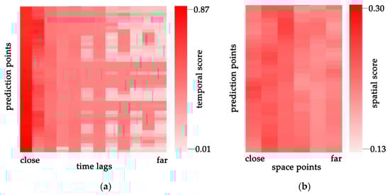 Attention visualization of average score on different prediction points at (a) different time lags and (b) different space points.