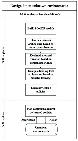 As shown in Figure 2, in the offline phase of the motion planner, the main task is to learn navigation policies in unknown dynamic environments. First, key information about the robot and the environment is extracted to construct a Partially Observable Markov Decision Process (POMDP) model, since in unknown environments the robot cannot directly obtain the complete environmental state to construct a general Markov Decision Process (MDP) model. Then, a neural network architecture with a memory mechanism is built to solve the POMDP model, which integrates historical data with the current observations to construct the robot’s own belief state as its cognition about environments. Next, to overcome the challenge of sparse reward, a reward function based on domain knowledge is constructed by reward shaping, which can increase the density of reward signals and accelerate the convergence of the training process. To further improve learning efficiencies, the architecture of training tasks is constructed by transfer learning. Finally, MK-A3C is used to learn the navigation policy. In the online phase, navigation policy learned in the offline phase takes the environmental information detected by the sensor and internal states of the robot as its input, and output continuous control commands to navigate the robot to a given goal location.