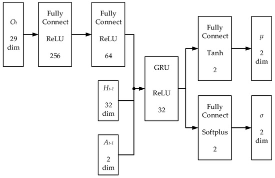 Firstly, the GRU-based memory network architecture can avoid being trapped in local minima caused by partial observability of environments. A3C is used to solve MDPs, but MDPs can only describe fully observable problems such as Go, Chess, etc. Therefore, a POMDP model is built to formally describe the proposed problem. To solve the POMDP, this paper constructs a GRU-based memory network architecture. The recurrent neural network unit GRU is used as a function approximator of the belief state , which takes abstract historical data, the current observation and last action as input. As shown in Figure 4, the observation first is passed through two layers of Fully Connected (FC) layers, and the numbers of their hidden units are 256 and 64, respectively. Then, the GRU layer takes them as input that are extracted from 64 dimensions of observation features, the 32 dimensions of the last hidden state of the GRU and the two dimensions of the last action. The number of hidden units of the GRU layer is 32. The output layer is divided into two streams. One stream uses a FC layer to output the expectation of the Gaussian distribution of the action space, and the other stream outputs the variance. Instead of directly outputting actions, constructing the action distribution can improve the randomness of the action selection in the training process and increase explorations in unknown environments.