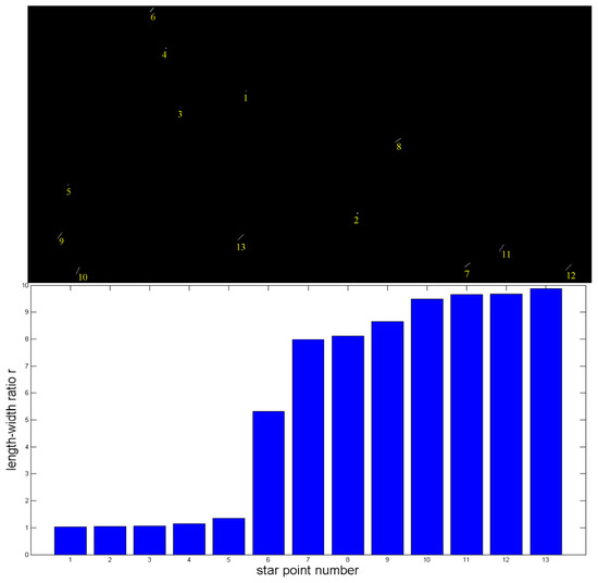 In general applications, true star points approximately conform to 2-D Gaussian distribution, the length-width ratio of which is small. While fake star points approximately conform to long strip distribution, the length-width ratio of which is large. Sort the N star points in an image from small to large according to the length-width ratio , as shown in Figure 3.