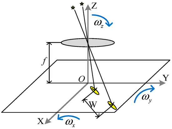As shown in Figure 4, W is the distance between the centroids of the corresponding star points. are the three-axis angular velocity of the star sensor. f is focal length of the lens. D is pixel size of the image sensor. T is exposure time of the image sensor. t is the time between the end of first frame exposure and the beginning of second frame exposure.