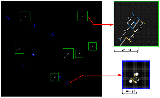 When the window size is large, it may contain other star points. For this case, it will be processed in the elimination of fake stars. As shown in Figure 5, two star images are matched according to the above algorithm, where the Gaussian distribution star points are located in blue matching windows, and the long strip distribution star points are located in green matching windows.