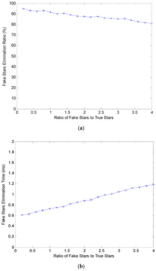 The experiment is carried out on 20 × 10,000 groups of simulated star images, and the elimination ratio and elimination time of each group are determined. In this experiment, the elimination ratio is the percentage of the eliminated fake stars to all fake stars. The elimination time includes evaluating the authenticity of star points, matching corresponding star points, and eliminating fake stars. The experimental results are shown in Figure 7.