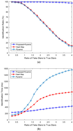 As shown in Figure 8, with the number of fake stars increasing, the identification ratio of the hash map algorithm and the pyramid algorithm decreases significantly, while the proposed algorithm is almost unaffected. Even if the number of fake stars reaches four times that of true stars, the identification ratio of the proposed algorithm can still reach more than 96%. Since the proposed algorithm needs two consecutive frames of star images, the identification time is longer than that of the other two algorithms when the number of fake stars is small. However, with the number of fake stars increasing, the identification time of the proposed algorithm is much lower than that of the hash map algorithm and the pyramid algorithm.