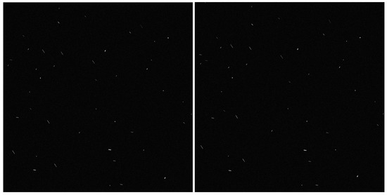 According to Table 3, star image 1 is taken as the datum, the star points in images 2–5 are extracted, and these star points are superimposed into star image 1 according to random position as fake star points caused by the plume, thereby generating a plume star image as shown in Figure 9.