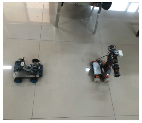 In this section, the performance of the proposed algorithm was evaluated by a group of two robots with a leader–follower structure as shown in Figure 2. The group of robots moved in a rectangular area in an indoor environment. Both robot carried an orientable range finder and wheel encoders for odometry. The range finder was used to compute the measurements aimed at the leader robot. Both the range measurements and the odometric measurements were supposed to be affected by a zero-mean white Gaussian noise.
