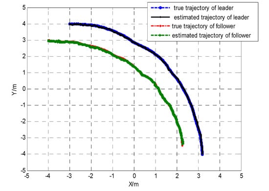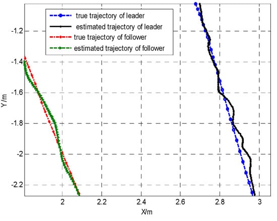Communication delays are supposed to be time invariant such as 0.1 s. The filtering period was 0.8 s. As shown in Figure 3, the true trajectory for the leader–follower robot team was compared to the trajectory estimated using the proposed cooperative localization algorithm.