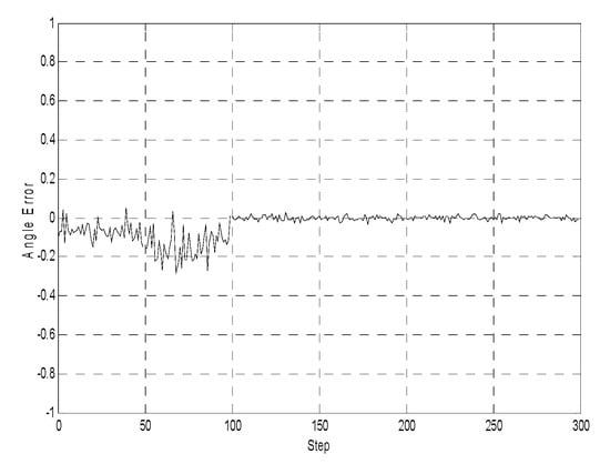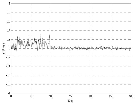 Figure 5, Figure 6 and Figure 7 illustrate the comparative error curves of the follower robot by using the traditional EKF method in the first 100 steps and the proposed method in the next 200 steps, respectively. It can be seen that the estimation errors of the proposed algorithm were bounded in a smaller range when compared with the traditional EKF method.