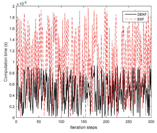 It can be seen from Figure 8 that the computational efficiency of the DEKF algorithm was better than traditional EKF algorithm even though the time delay was added to the filtering process.