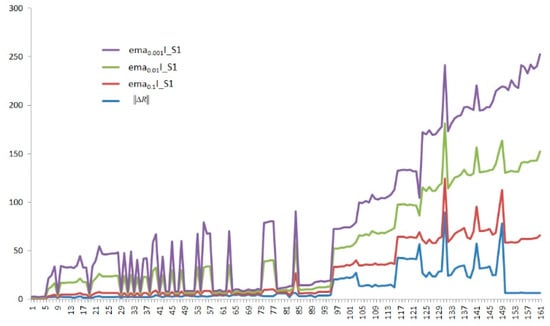 where k is the discrete time indexing the recoding interval [0,L] when the chemical vapor is present in the test chamber, and k = 1,2, …, L. represents the real scalar, its initial state is set to zero, and the scalar represents the operator’s smoothing parameter, namely , which refers to the quality of its feature and its time sequences []. Setting the three different values with 0.1, 0.01, and 0.001 of to calculate the response with increase (I) and decay (D) in the sensors. The results that were obtained with the Equation (1) for the three values of and the result of the extraction feature with Equation (1), as shown in Figure 2.