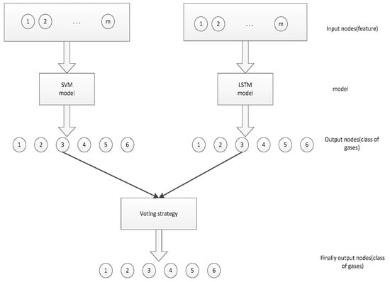 Multi-classifier ensemble learning combines with a variety of learning algorithms, so the corresponding hypothesis space can be expanded, which reduces the drawbacks of a single learning algorithm []. With the efficacy of multi-classifier ensemble learning, this paper proposes a supervised learning algorithm that is based on a multi-classifier ensemble learning. With the objective to improve the calculation accuracy, we have developed a multi-classifier integrated with a new loss function and SVM for the base classifier LSTM, which greatly combines the advantages of SVM for small samples with the advantages of LSTM in time series. This multi-classifier can be integrated by the voting strategy with the normalized weighting. We select the ‘Gas Sensor Array Drift Dataset’ Dataset, which is a benchmark dataset available online at UCI machine learning repository, to verify the method. The proposed method is capable of compensation drift in gas sensors and it does not system re-calibration or background information, which makes it feasible for use in real time applications.