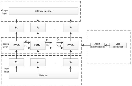 The overall framework of the LSTM model that was constructed in this paper is shown in Figure 6, which includes three functional modules: the input layer, the hidden layer, and the output layer. The input layer is responsible to process data in the dataset to meet the network input requirements. The LSTM cells that are shown in Figure 5 were used to construct a single-layer circulatory neural network in the hidden layer, which adopts the Adam optimization. The output layer can classify the results of LSTM training, further analyzing its accuracy.