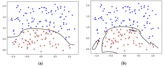 Synthesize two-dimensional data to illustrate regularization, (a) normal, (b) overfitting.