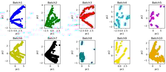 Principal component analysis (PCA) [] is carried out for these 10 datasets batches in order to intuitively observe and analyze the distribution of these 10 batches in the datasets. Figure 8 shows the influence of drift on data distribution. As time goes by, there is a significant bias in the two-dimensional subspace distribution between batch 1 and other batches because of the drift.