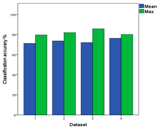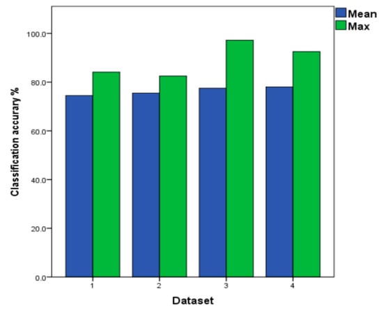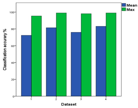 The Mean and Maximum Values of SVM under the Four Datasets. Green: the highest classification accuracy in every dataset; Blue: the average classification accuracy in every dataset.