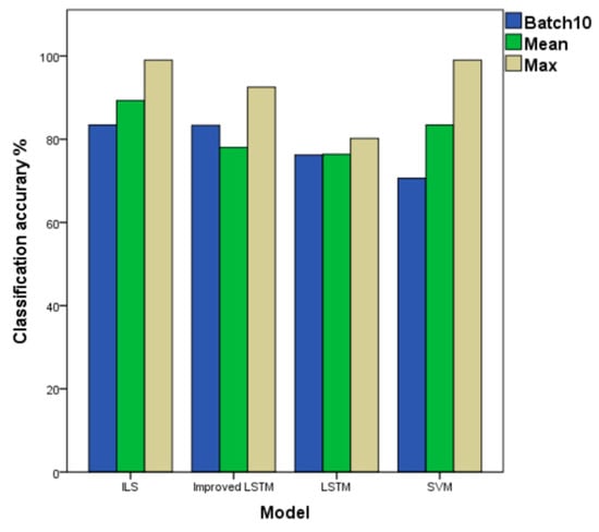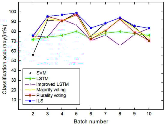 The classifier ensemble performs better than the SVM trained at batch points 2, 3, 4, 5, 9, and 10. As mentioned above, this SVM is a very strong baseline and, thus, the ILS performs better than or as well as this SVM is a better result. The ILS model better than the classifier of LSTM at all batches, from batch 3 to batch 10. In the case of batch 9 and batch 10 for testing, the accuracy of the ILS model is 83.4%. In terms of the average accuracy and the accuracy with batch 10 for testing, ILS also performs better. In the highest classification accuracy rate, the ILS model reaches a maximum of 99.0%. Note that, although the Improved ILSM helps to slightly improve the performance of the LSTM trained, it performs worse than some of the batches.