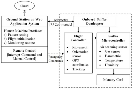 Due to short flight duration (<40 min), several settings must be initialized to permit the quadcopter to perform optimally, such as the target point, in the form of GPS coordinate, and quadcopter flight behavior, in the form of altitude, speed, and measurement pattern. The settings can also be made on the ground station system through the designed mission planner system which can communicate with the sniffer quadcopter using 433 MHz telemetry [27,28]. The architecture of the aerial platform system is presented in Figure 1. The ground station using an open source web application platform was also used to monitor all measurement processes. With the autonomous flight pattern, the quadcopter will run the sequential process according to the pre-flight command list. For intentional interruption of the process, an emergency system was designed so the user’s command can be delivered via the ground station control which will force the quadcopter either to make a landing or to fly back to the home coordinates. On board the sniffer quadcopter system one can find two controllers: the flight controller and sniffer microcontroller. The flight controller serves to maintain the stability of the maneuvers, together with an orientation sensor and a tracking pattern based on the input coordinate [29]. The sniffer system serves to perform air scanning and save the data on a memory card. Both controllers are always communicating with each other to determine when to carry out the data retrieval process.