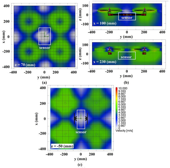 Air velocity on quadcopter in various perspectives: (a) Point A—top view; (b) Point B—front view; (c) Point A—bottom view.