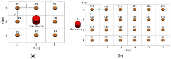 The grid pattern and wind algorithm were integrated into the gas measurement process which was dynamically distributed [36]. Measurements can be performed for the case of either point source or non-point source. The point-source measurement is used for gas emissions with known locations, for example, chimney exhaust gases in industrial districts. However, as the gas dispersion depends on the wind direction an eight-point (P1–P8) square pattern is used to cover all wind blowing directions, as illustrated in Figure 6a. On the other hand, non-point source measurement is used to locate the gas source based on the particle density and wind direction. Data acquisition for this method allows the user to observe the gas dispersion gradient toward the closest point to the source (which has the highest particle concentration), exemplified in Figure 6b. In the field test, the grid pattern with 24 sample points (S1–S24) placed in a 4 × 6 matrix was able to be extrapolated using the Gaussian kernel method. The size of the cell depends on the sensitivity of the gas sensor.