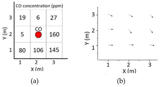 The analysis result for the gas dispersion vector with respect to the gas source position showed that the vector was . The carbon reading was modeled using a 2D contour in order to see the vector more clearly. The CO reading correlated with location was formulated in a matrix form shown in Equation (15).