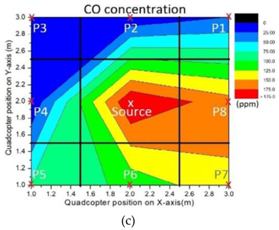 The other method was the non-point source, used to pinpoint the location of the gas source and also its concentration. This method adapts a grid pattern with 24 cells to collect data of CO with two types of gas sensors used simultaneously to ascertain data validity. The gas dispersion analysis results showed that the gas dispersion vector had changed twice, thus indicating two possible positions for gas source location. The gas dispersion vector has been analyzed using both the measurement position and CO concentration matrices. The readings of both sensors showed the same gas dispersion pattern, indicating the highest value of CO was in the S17 cell. The differences in the accuracy of data reading were affected only by the sensitivity of the MOX sensors. The correlation between gas dispersion and wind behavior must be known to overcome the possibility of result misinterpretation due to wind influence. Logically, the gas source must be in the vicinity of the cell having the highest CO concentration. A bivariate Gaussian kernel has been used to locate this cell’s position. The gas source was calculated with the same method used in the case of the point source; thus, the weight cell in the form of standard deviation was obtained with the value of CO between 118.06–133.24 ppm while the actual value was 125 ppm. Overall, the field tests were done by manipulating the gas source; the quadcopter’s altitude maintained at 1 m from the ground to collect data which then were calculated accordingly to acquire the gas source location. For the case of a small amount of burning coal, the experiment was possible only at low altitude with manual control of the quadcopter flight. The sensitivity of the sensors must pass the reliability test before being placed on the quadcopter because it affects the size of the cells. Finally, the analyses using normal dispersion and ANOVA were essential to obtain the gas concentration and gas source position.
