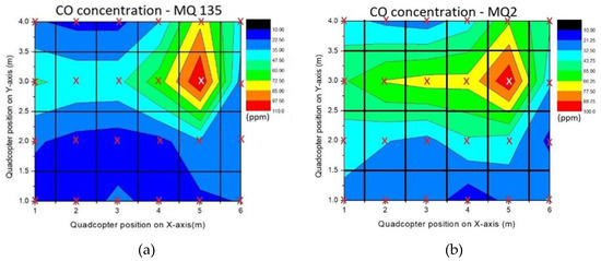 The non-point source experiment was done by collecting 24 sample points of CO concentration during 360 s of flight time. Data acquisition was done in the same manner used for the point source method. Two types of MOX sensors were used, i.e., MQ-135 and MQ-2 which were placed together on the quadcopter’s front frame. Both sensors were used simultaneously to ascertain the validity of the data and to get better analysis over the gas dispersion. In the field test, some burning coals were used as the CO source, placed on the position (X, Y) = (5, 2.5). Data of CO concentration were saved in the matrix form as presented in Equations (16) and (17). The CO concentration of the source was predicted, and the location of the source was analyzed through gas dispersion using the variant data of each cell.