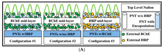 As an initial test of a reusable electrode, the biosensors were prepared by first developing the PNT mixture. The PNT mixture was crafted prior to its anticipated need. PNT mixture fabrication included being vortexed briefly and then incubated on a rotator in a temperature-controlled environment at 5 °C, 30 rpm for one week. The PNT mixtures were kept refrigerated until needed for biosensor fabrication. The biosensors were prepared by first depositing 2.5 μL of PNTs containing the encapsulated BChE on the working electrode, which was then allowed to dry in a hood at room temperature and pressure (average of 65 °F and 745 mmHg). Then, 2.5 μL of 1000 U/mL HRP was deposited on top of the PNTs and allowed to dry. Next, 2.5 μL of Nafion was deposited and allowed to dry. Prior to selection and formal investigation into the compositional matrix described, several fabrication processes were tested. While some configurations involved a simple change in the layering order, or no protective Nafion covering, each compositional matrix was tested with the same protocol. Qualitative performance criteria were used to select the compositional matrix with the highest prospects for continued research. Ultimately, the primary test Configuration #1 (see Figure 2A) was chosen for this research; it utilizes PNT encapsulated BChE followed by HRP then Nafion, as described above.
