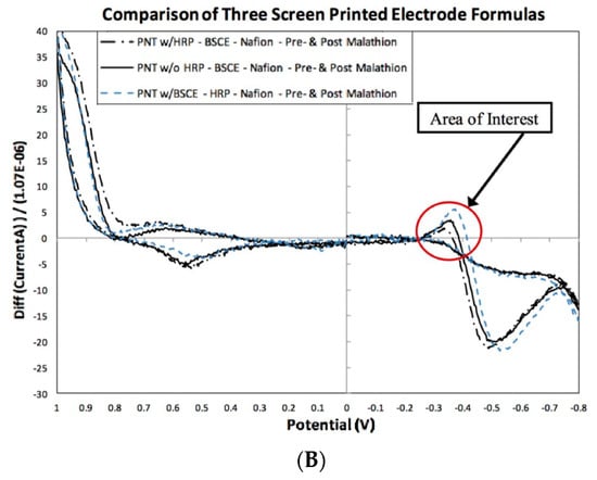 The analysis of cyclic voltammetry (CV) signatures for the BChE-based biosensor notably used the difference between pre-malathion and post-malathion exposures (Figure 3, lines A and B). The lines in Figure 3 are representative of a single biosensor electrode test. Line A represents a single scan of the fabricated biosensor electrode prior to malathion exposure for CV measurement number two (CV#2). Line B represents a post-malathion exposure scan, CV#4. Line C is the difference in current between lines A and B. The current change, ΔA, at −0.30 through −0.40 V the same area of interest shown in Figure 2—was used for the percent inhibition calculation. As shown in Figure 3, ΔA for malathion, the line C peak, which represents the current change between pre-malathion and post-malathion exposures, is the highest in the same area of interest, as indicated in Figure 2.