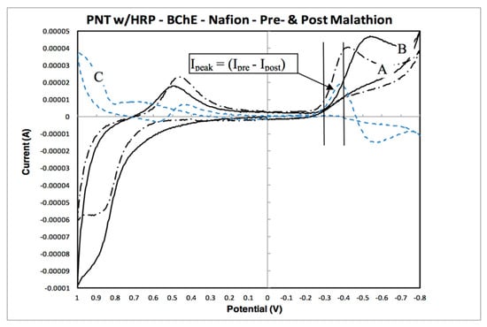 Representative CV data for peptide nanotubes (PNT) with horseradish peroxidase (HRP)/BChE/Nafion composition matrix: Line A is (Ipre), line B is (Ipost), and line C is (Ipre − Ipost).