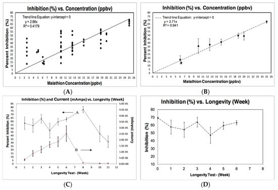 Biosensor test data results: (A) Malathion concentration from 0 ppbv to 25 ppbv, (B) Malathion concentration from 6 ppbv to 25 ppbv. BChE/BSCh Longevity Test: (C) Inhibition measured after biosensor exposure to 25 ppbv malathion, (D) First six weeks after biosensor exposure to 25 ppbv malathion.