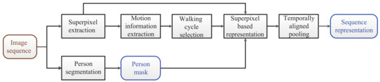 This paper focuses on appearance representation for video-based person re-id. In this section, we introduce the proposed superpixel-based temporally aligned representation by (1) extracting motion information based on superpixel tracking (Section 3.1), (2) selecting the “best” walking cycle using an unsupervised method (Section 3.2), and (3) constructing a 3D representation based on superpixel-based representation (Section 3.3) and temporally aligned pooling (Section 3.4). We depict the entire framework in Figure 1.