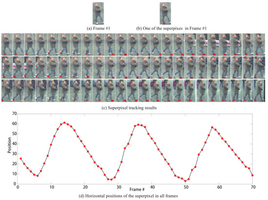 where denotes the representation of superpixel x. In this paper, we use the color feature, i.e., HSV histogram, to represent the superpixels. Figure 2c shows the superpixel tracking results corresponding to the initial superpixel in Figure 2b. We denote the horizontal positions of the centers of the superpixel set . The final motion information of the region corresponding to the jth superpixel can be described as , as shown in Figure 2d. We can see that the superpixels along the entire video sequence is about the right foot. There is a high probability that it is a part of a person with somewhat semantic information, which makes the motion information extraction algorithm very robust.