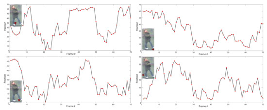 Illustration of motion information of feet with some examples on the iLIDS-VID dataset. We annotate the mean horizontal positions of the right foot of a person’s image sequence, and then we show the horizontal positions (red dots) with frame index.
