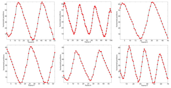 To address the problem of abundance and noise caused by cluttered background and occlusion, we use only one walk cycle of frames to represent a video sequence. Therefore, after obtaining the redundant motion information (i.e., horizontal positions) of the N superpixels, we are trying to select the “best” walking cycle . The motion information of a superpixel of the lowest portions of human is described as its horizontal displacements with time as in Section 3.1. The fragments of the motion information can be considered as the candidate walking cycles. Then, a natural question is: what is the “best” walking cycle for person representation? The key to this question is to mathematically model the motion information of a walking cycle, for which we adopt the sinusoid function, based on two observations: (1) Many bipedal robots use an intuitive walking method with sinusoidal foot [76]. It is based on the hypothesis that the trajectory of the feet follows sine waves in the x, y and z directions. That is consistent with the biomechanics of gait [77]. (2) The motion information of feet (horizontal positions) annotated on the iLIDS-VID dataset is almost exactly sinusoidal, as shown in Figure 4. Therefore, we model the horizontal displacements of feet as a sinusoid.