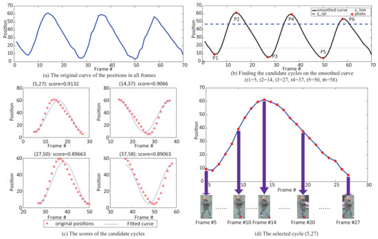 We also present an example to visually illustrate our algorithm in Figure 5, corresponding to the scenario in Figure 2. For the jth superpixel shown in Figure 2b, we first smooth its motion information curve (as shown in Figure 5a), the smoothed curve is shown in Figure 5b. Figure 5b also indicates the extreme points with red dot. Next we evaluate these curves, the scores are calculated using their fit error to sinusoid, as shown in Figure 5c. The best cycle is selected with the highest score, as shown in Figure 5d. Note that, it may still suffer from background clutter and occlusions, although the proposed superpixel based method is more robust than pixel based methods. And selecting the best walking cycle can avoid this problem to some extent. Two more examples and more detailed discussion are shown and discussed in Section 4.3.