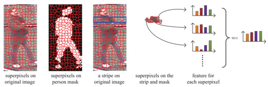 To sum up, we proposed a superpixel-based LOMO (SPLOMO) representation for still images, as shown in Figure 6. Particularly, we first perform superpixel segmentation and person segmentation, using SLIC method [75] and Deep Decompositional Network (DDN) [78] respectively. Note that, the person mask is a binary map, where the semantic information of different parts is not used. Then for each strip, only the superpixels lie in this strip and the person mask are considered to compute the histogram based representation. In our implementation, for a given strip, a superpixel is considered when meeting two conditions: (1) its overlap with the corresponding person mask O is bigger than the threshold ; (2) its center is in the strip. The final feature is obtained by a max operation as in [8].