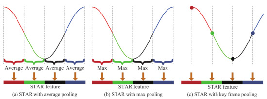 Illumination of temporally aligned pooling representation, with . Three pooling manners for temporal alignment are presented: (a) average pooling, (b) max pooling, and (c) key frame pooling.