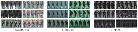 In this section, we conduct our experiments on three publicly available video datasets for video-based person re-id: the iLIDS-VID dataset [30], the PRID 2011 dataset [79] and MARS [49], as shown in Figure 8. The iLIDS-VID dataset consists of 600 image sequences for 300 people from two non-overlapping camera views, and each image sequence has variable length consisting of 23 to 192 image frames, with an average number of 73. The dataset is very challenging due to clothing similarities, cluttered background, occlusions, viewpoint variations across camera views (Figure 8a). The PRID 2011 dataset includes 400 images sequences for 200 people from two adjacent camera views. Each image sequence has variable length consisting of 5 to 675 image frames, with an average number of 100. In our experiments, the sequence pairs with more than 21 frames are used to the requirement on the sequence length for extracting walking cycles. The main challenges of the dataset are lighting and viewpoint variations across camera views (Figure 8b). The MARS dataset consists of 1261 identities captured by 2 to 6 cameras. The train and test sets contain 631 and 630 identities respectively. 20,175 tracklets are obtain by DPM detector [80] and GMMCP [81] tracker, among them 3248 are distractors due to false detection or tracking. A large number of tracklets contain 25–50 frames, and most pedestrians have 5–20 tracklets. The MARS dataset is more challenging due to distractors, detected or tracked bounding box, besides the challenges mentioned above (Figure 8c).