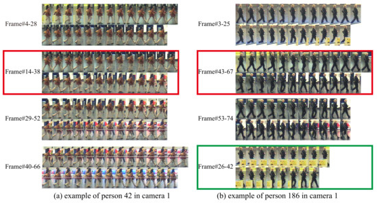 Two examples of selected walking cycles on iLIDS-VID. The candidate walking cycles for each video is presented, and the “best” walking cycle we selected is indicated by the red bounding box. Note that the image sequence in the green bounding box in (b) is not a candidate walking cycle. The frame indexes are given on the left side of the corresponding image sequences.