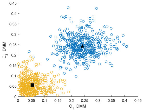 To demonstrate the performance of the MAWG method, in the simulation experiment, DMM or RMET is selected as the characteristic of the signal. The PU signal is a multiple component signal [22] in this experiment. According to the spectrum sensing statistical feature extraction method that is described above, 2000 feature vectors are extracted. Firstly, 1000 feature vectors are used to train the GMM framework. After the training is completed, the classifiers which are used for spectrum sensing are obtained. Then, the other 1000 feature vectors are used for testing.